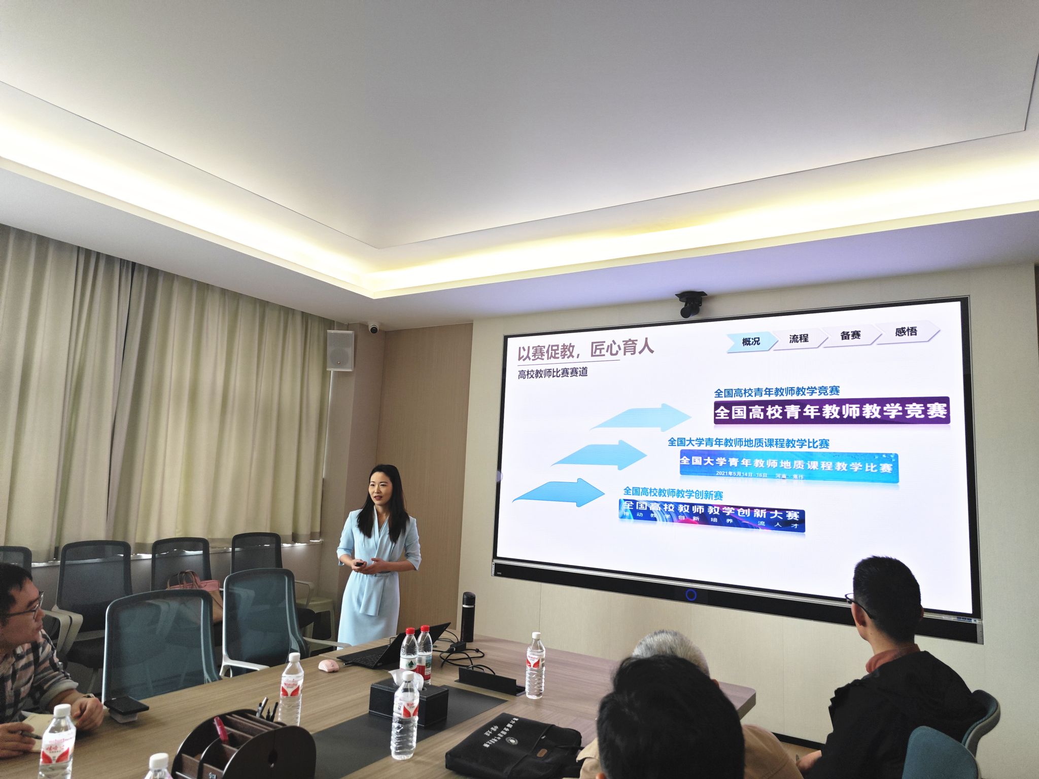资源学院副院长李占轲主持,他介绍了学院设立“资源教育教学论坛”的背景和意义,并介绍了陈思老师的教学和获奖经历。陈思老师以“从青教赛到优课堂——教学能力提升的进阶之路”为题作报告,从“以赛促教,匠心育人”和“以建促学,优课铸魂”两方面分享了青教赛经验和课程建设经验。她总结青教赛的进阶路径分为5步:强化教学设计、打磨教学细节、提升语言艺术、形成教学风格、从容应对教学节段抽选,可以从双语教学、AI赋能、教具完备等方面进行内容提升。她谈到参加青教赛的感悟认为教学时要思考“老师到底教什么,学生到底学什么”,要以学生为中心,让学生思维“长见识”“能量转化”,面对人工智能、AI的挑战,要注重培养学生的思维更新和思辨能力。她结合自己的课程介绍了课程建设经验,重点介绍了课堂教学、实践教学、科教融合和学科交叉的课程建设方法体系。与会教师就教学投入、课程互动、教学模式优化、如何利用AI建设课程等问题与陈思老师进行了交流。湖北省教学名师徐思煌老师认为设立“资源教育教学论坛”营造了学院教育教学交流的良好氛围,鼓励年轻教师多参加论坛并充分发挥教学团队的作用不断成长。