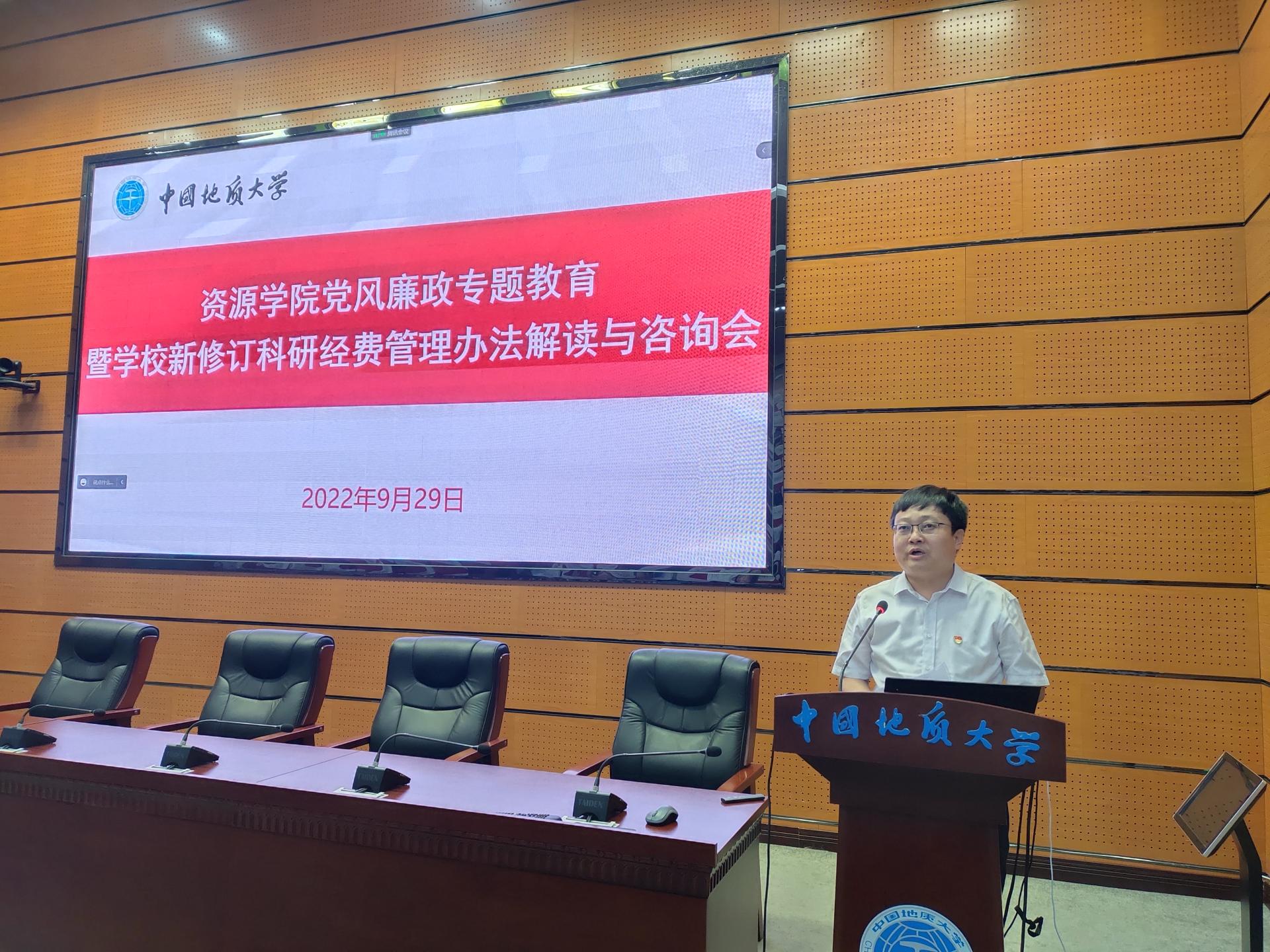 9月29日下午,资源学院党委在东区教学综合楼A0113会议室召开党风廉政专题教育暨学校新修订科研经费管理办法解读与咨询会。财务与资产管理部部长杨从印,副部长马晓霞、彭磊,相关科室负责人,学院领导班子全体成员、全院教职工、学生代表参加会议。会议以线上、线下相结合的形式进行,学院党委书记高复阳主持会议。