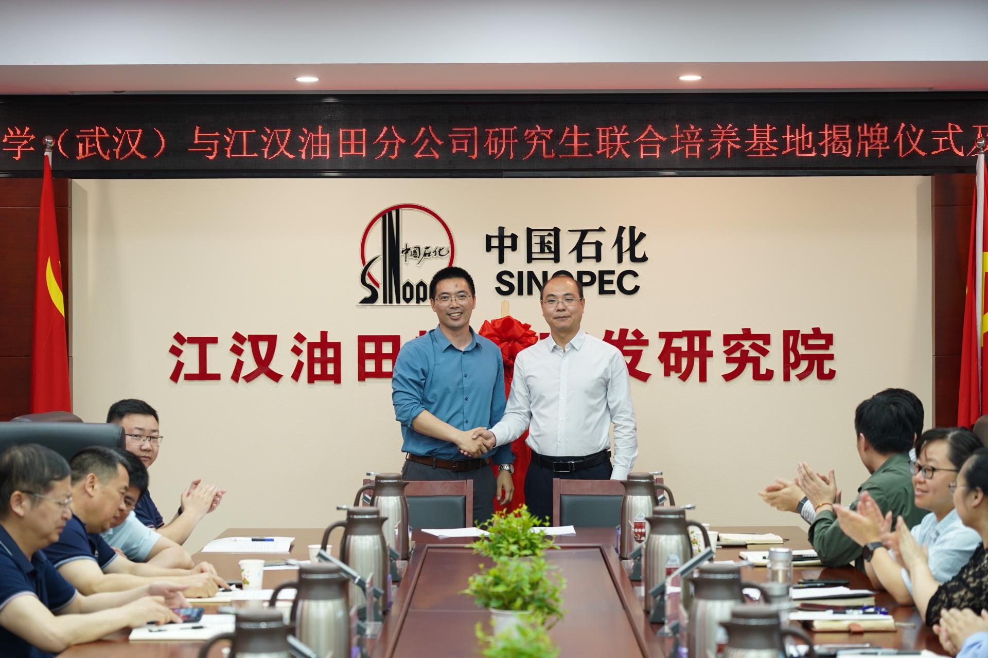严德天和包汉勇代表双方签署培养协议并授牌。包汉勇代表江汉油田分公司对地大老师们实地访问表示欢迎,对学校多年来为油田发展给予的支持表示感谢。他表示,此次签约为校企合作搭建了新平台、迈上了新台阶,双方将以研究生联合培养为契机,深入开展科研攻关,加强技术交流,更好地推进产学研深度融合,实现校企全面深入合作。