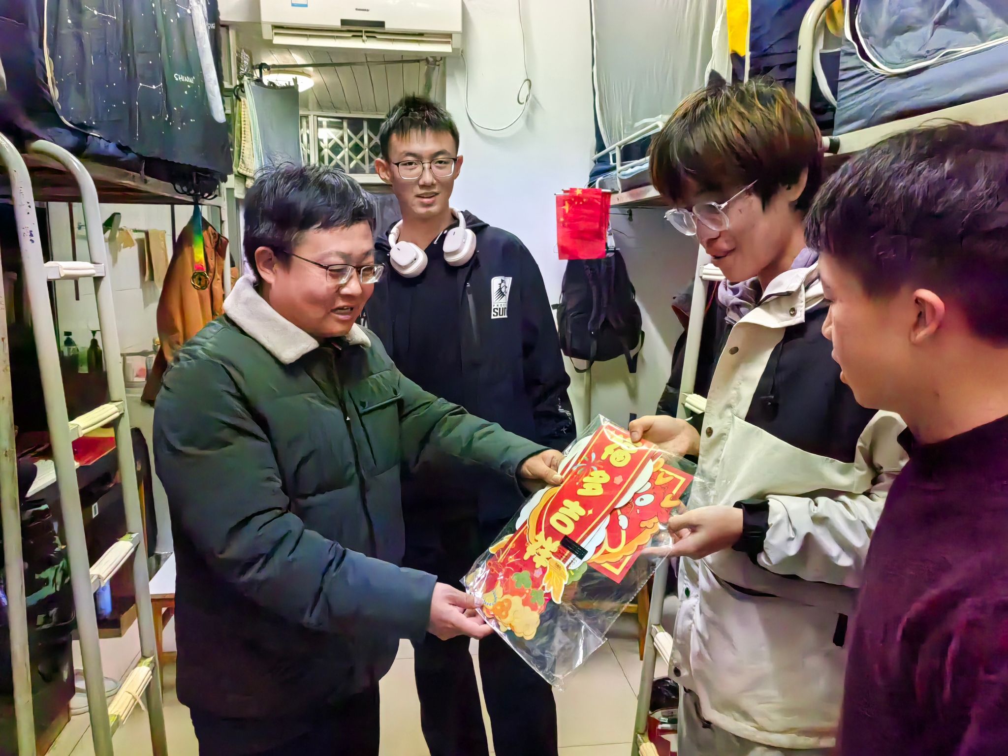 会后,高复阳、严德天一行走进宿舍,为同学们送“福”。