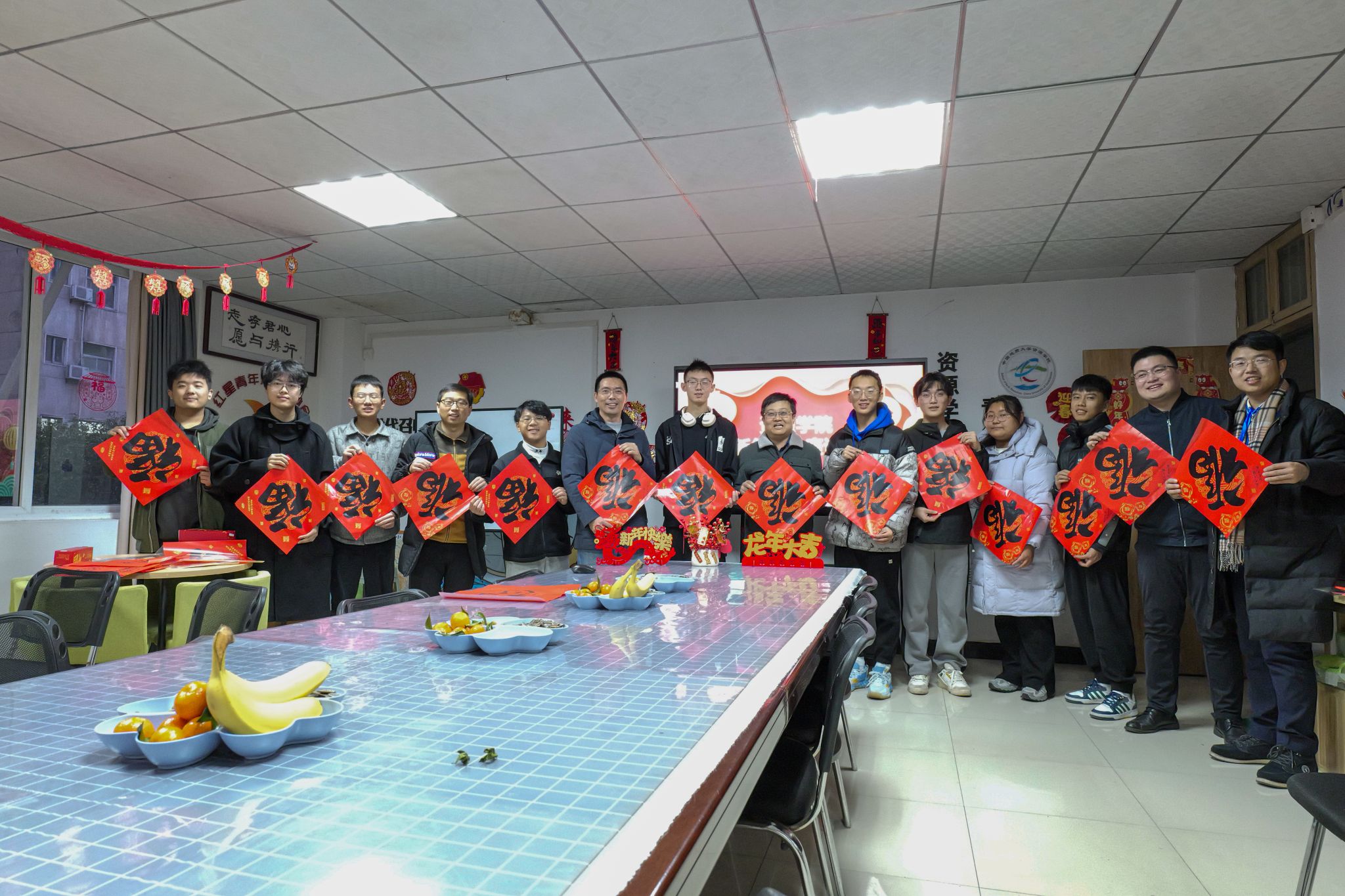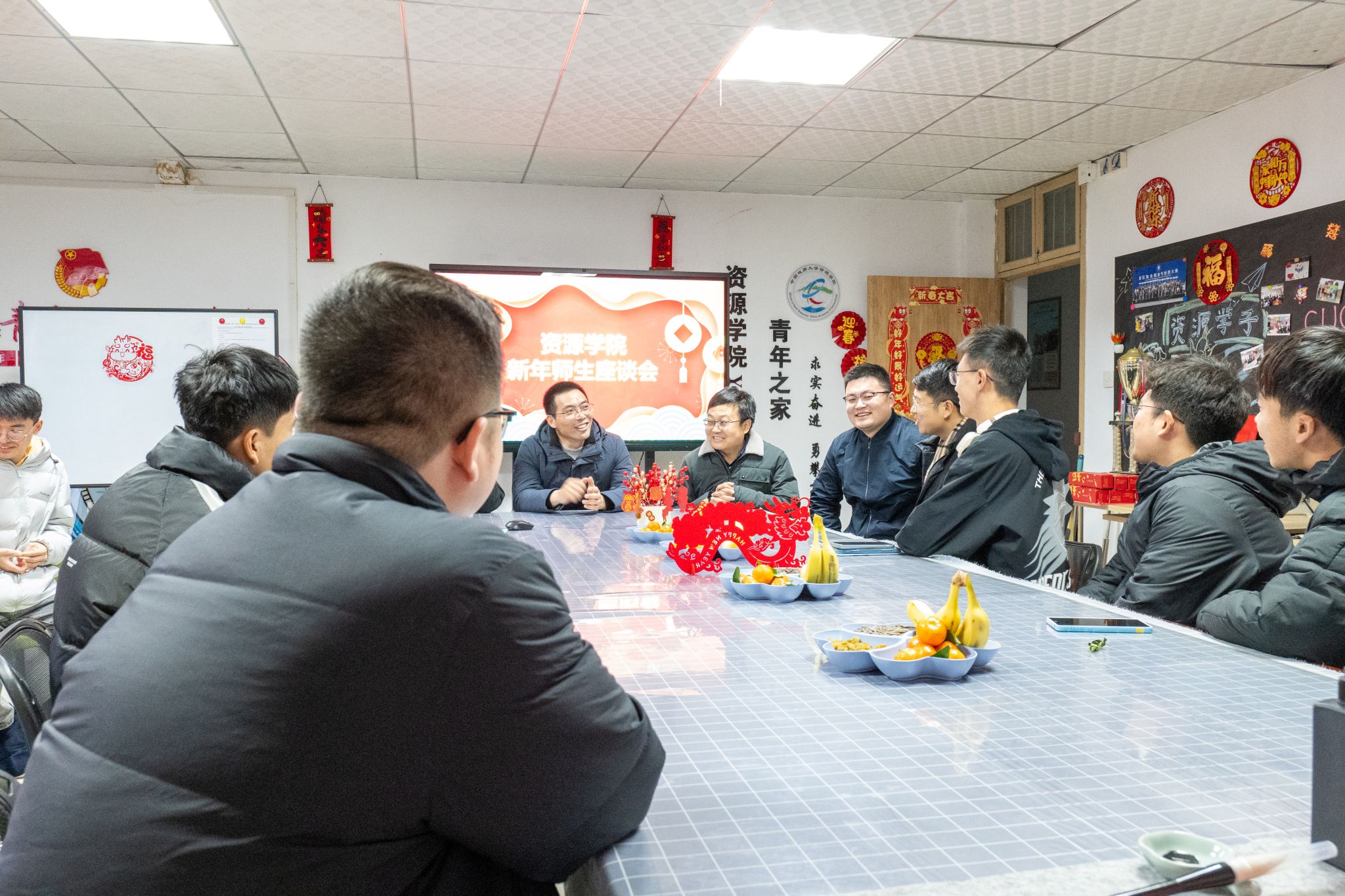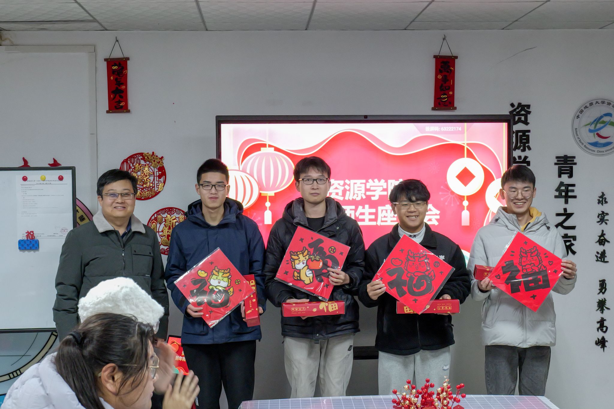 12月31日,“百福迎新”资源学院2024新年师生座谈会在56栋资源青年之家举行。学院党委书记高复阳、院长严德天、党委副书记谭文伦、辅导员彭鑫、霍少孟参加活动,与同学们欢聚一堂,共度佳节、共话成长。