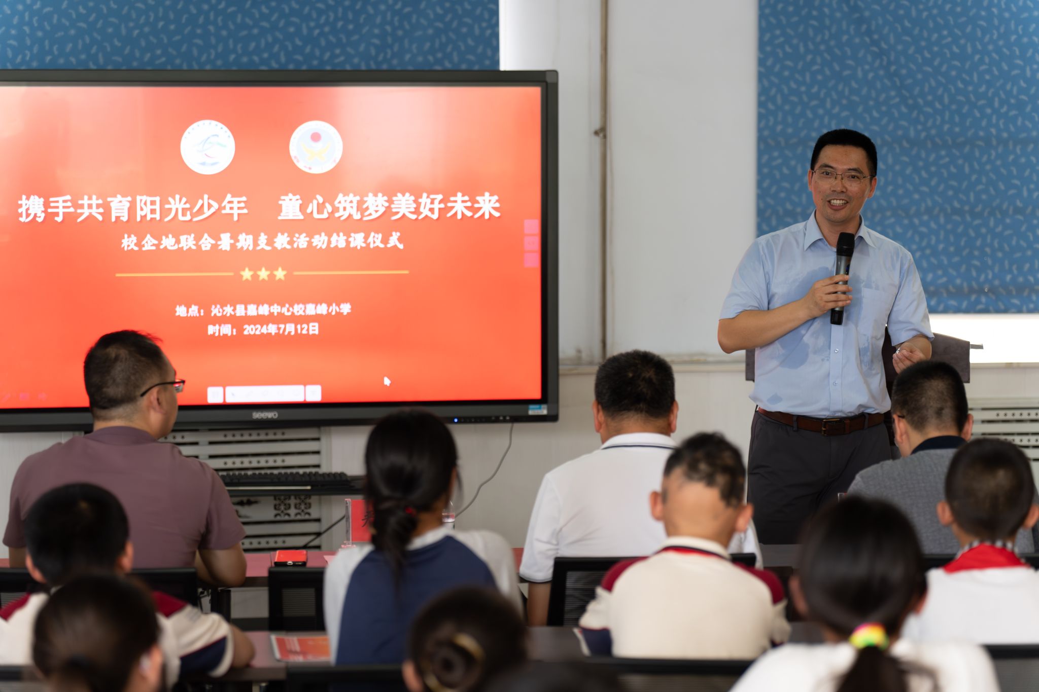 王雄讲话。他表示,实践团怀揣着爱心与责任走进学校,带来丰富的课程和温情的陪伴,和同学们共同度过了一个难忘的暑假,并期待同学们能够在这次支教活动中筑梦起航,茁壮成长,早日成长为担当家乡建设、国家建设的时代青年。