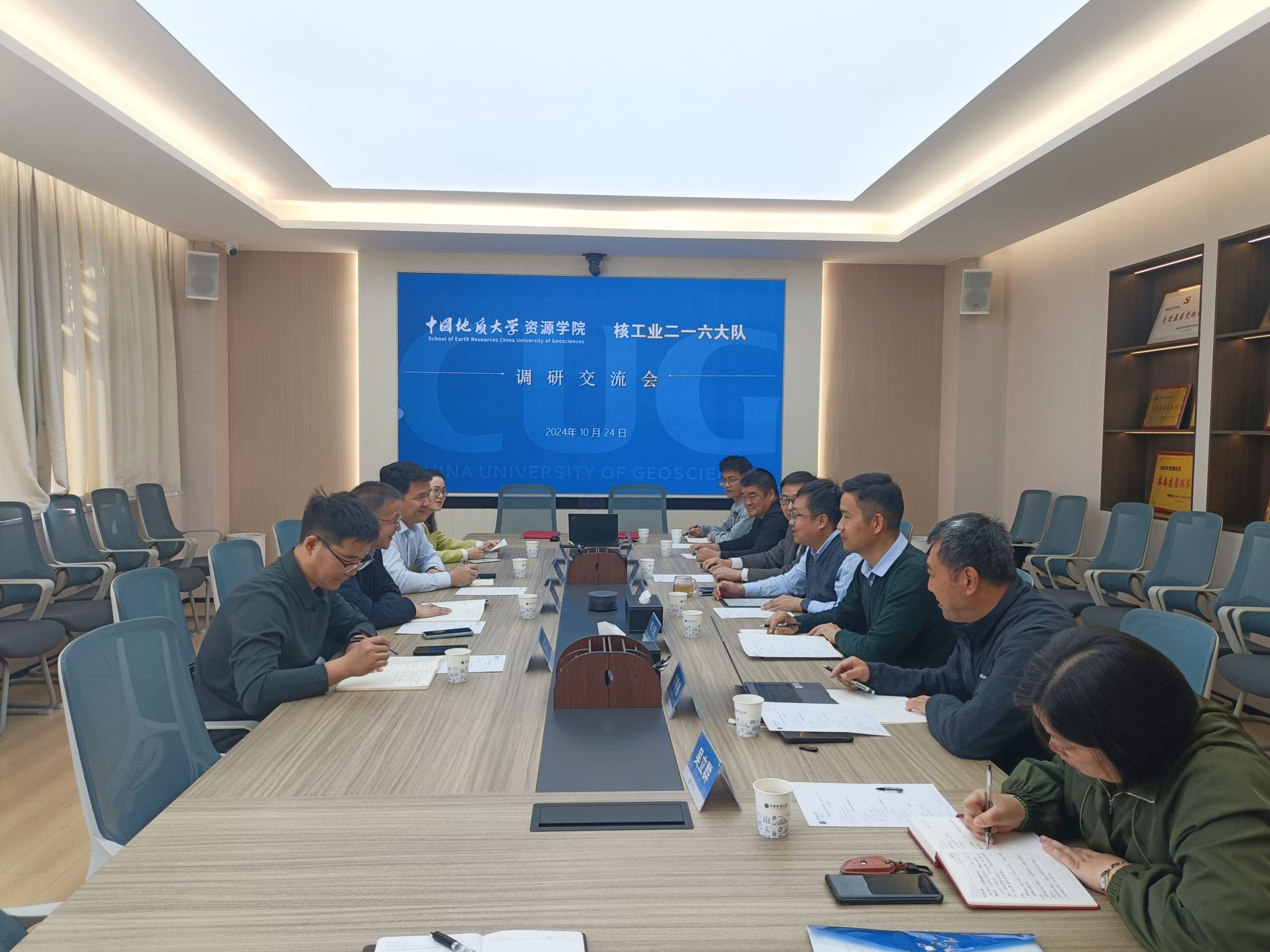 10月24日,核工业二一六大队大队长、党委书记师志龙一行来院调研交流,签署产学研合作协议,开展人才招聘工作,举行深化合作座谈会。学院党委书记高复阳,党委副书记、纪委书记谭文伦,副院长李占轲,全国模范教师、“全国高校黄大年式教师团队”负责人、盆地矿产系焦养泉教授和相应学科方向教师代表参加座谈会。