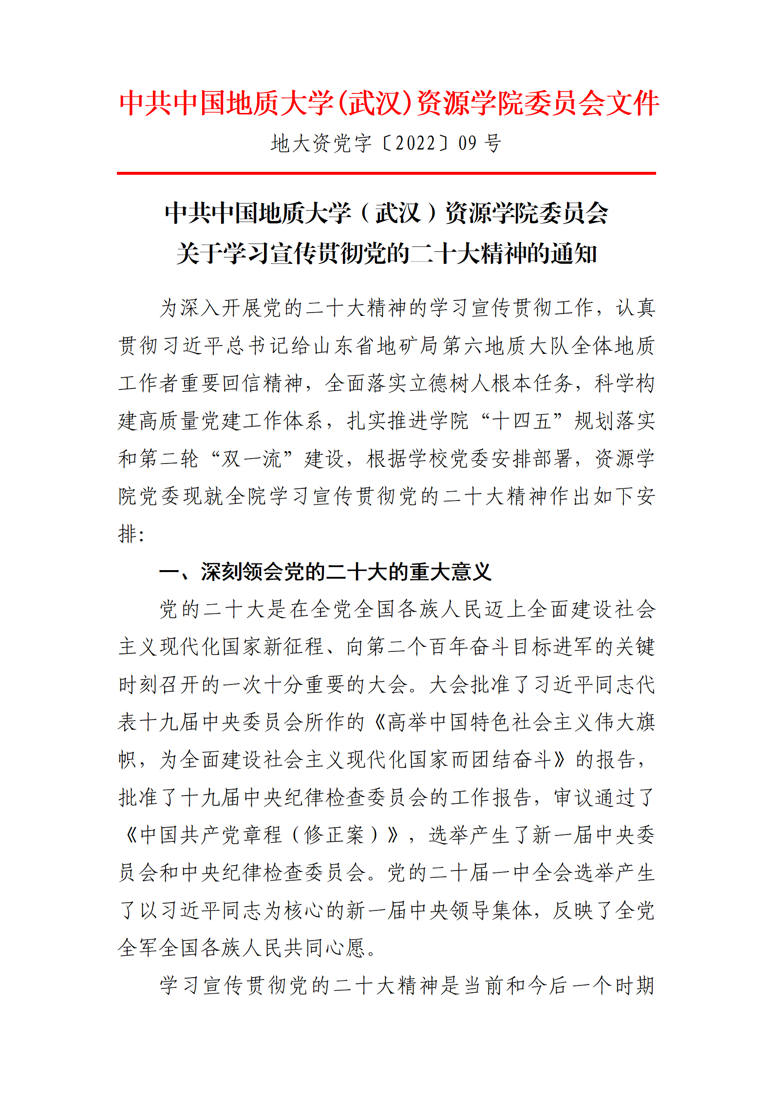 中共中国地质大学(武汉)资源学院委员会关于学习宣传贯彻党的二十大精神的通知