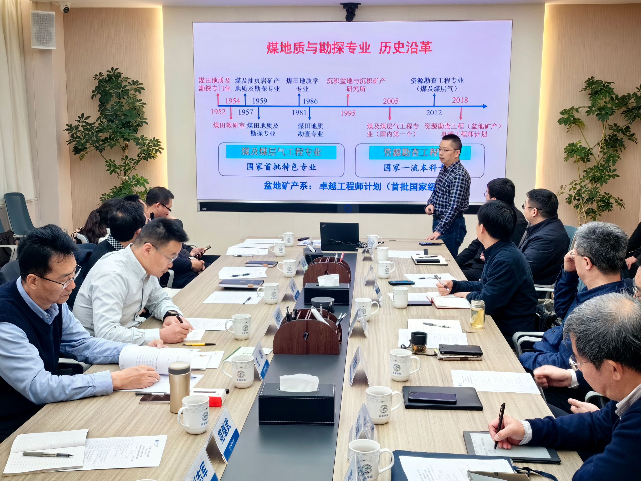 盆地矿产系主任甘华军介绍了盆地矿产系基本情况。他详细介绍了系师资力量、深部煤岩气勘探与开发科技成果、学科方向拓展、实验和实践平台等方面的情况。